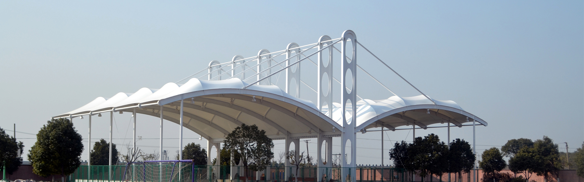 膜结构建筑风格独特,艺术性强,具有浓厚的现代气息,广泛应用于体育场馆、高速公路收费站、加油站、大型停车场、博览会展厅、公共场所、休闲场所、飞机库、景区装饰、大厅吊顶等。