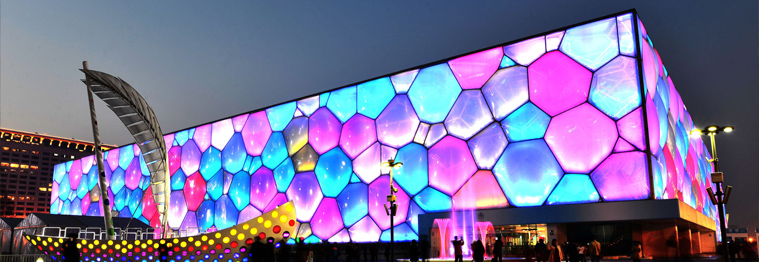 由ETFE(乙烯-四氟乙烯共聚物)生料直接制成。ETFE不仅具有优良的抗冲击性能、电性能、热稳定性和耐化学腐蚀性,而且机械强度高,加工性能好。近年来,ETFE膜材的应用在很多方面可以取代其他产品而表现出强大的优势和市场前景。这种膜材透光性特别好,号称“软玻璃”,质量轻,只有同等大小玻璃的1%;韧性好、抗拉强度高、不易被撕裂,延展性大于400%;耐候性和耐化学腐蚀性强,熔融温度高达200℃;具有良好的声学性能。自清洁功能使表面不易沾污,且雨水冲刷即可带走沾污的少量污物,清洁周期大约为5年。另外,ETFE膜可在现成预制成薄膜气泡,方便施工和维修。ETFE也有不足,如外界环境容易损坏材料而造成漏气,维护费用高等,但是随着大型体育馆、游客场所、候机大厅等的建设,ETFE更突显自己的优势。目前生产这种膜材的公司很少,这种膜材的研发和应用在国外发达国家也不过十几年的历史。北京奥运会场馆“鸟巢”和“水立方”膜结构采用ETFE膜材,是目前国内最大的ETFE膜材结构建筑,膜材采用进口产品。“鸟巢”采用双层膜结构,外层用ETFE防雨雪防紫外线,内层用PTFE达到保温、防结露、隔音和光效的目的。